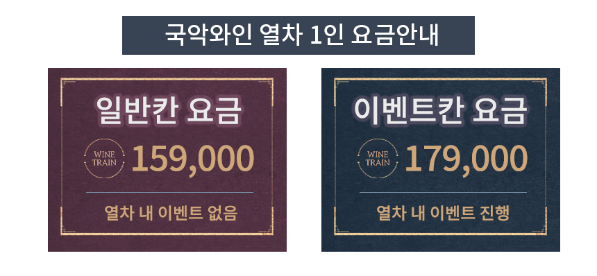• 국악와인열차 좌석은 전 좌석 마주보는 테이블 좌석입니다.좌석(방향)은 지정 불가하며 예약 순서대로 배정됩니다.
